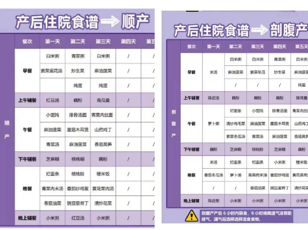 通常情況下,順產的媽媽產后3天就可以出院,剖腹產的媽媽需要5~7天才能回家,而醫(yī)院是不提供月子餐的,所以姐妹們需要提前為寶媽準備好月子餐,帶到醫(yī)院吃。